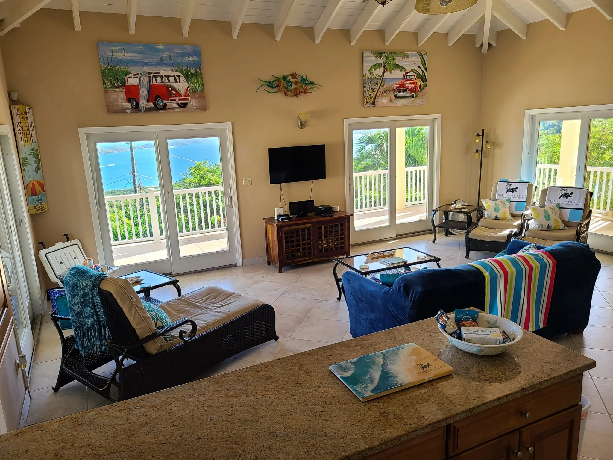 The kitchen and living room are multi-purpose areas great for sharing meals, board games, or family meetings. The Virgin Islands vacation rentals have stunning views of the Sea.